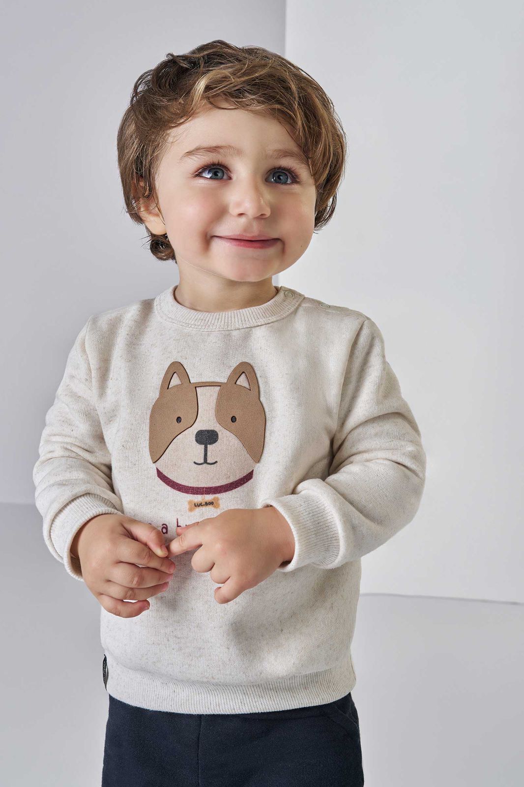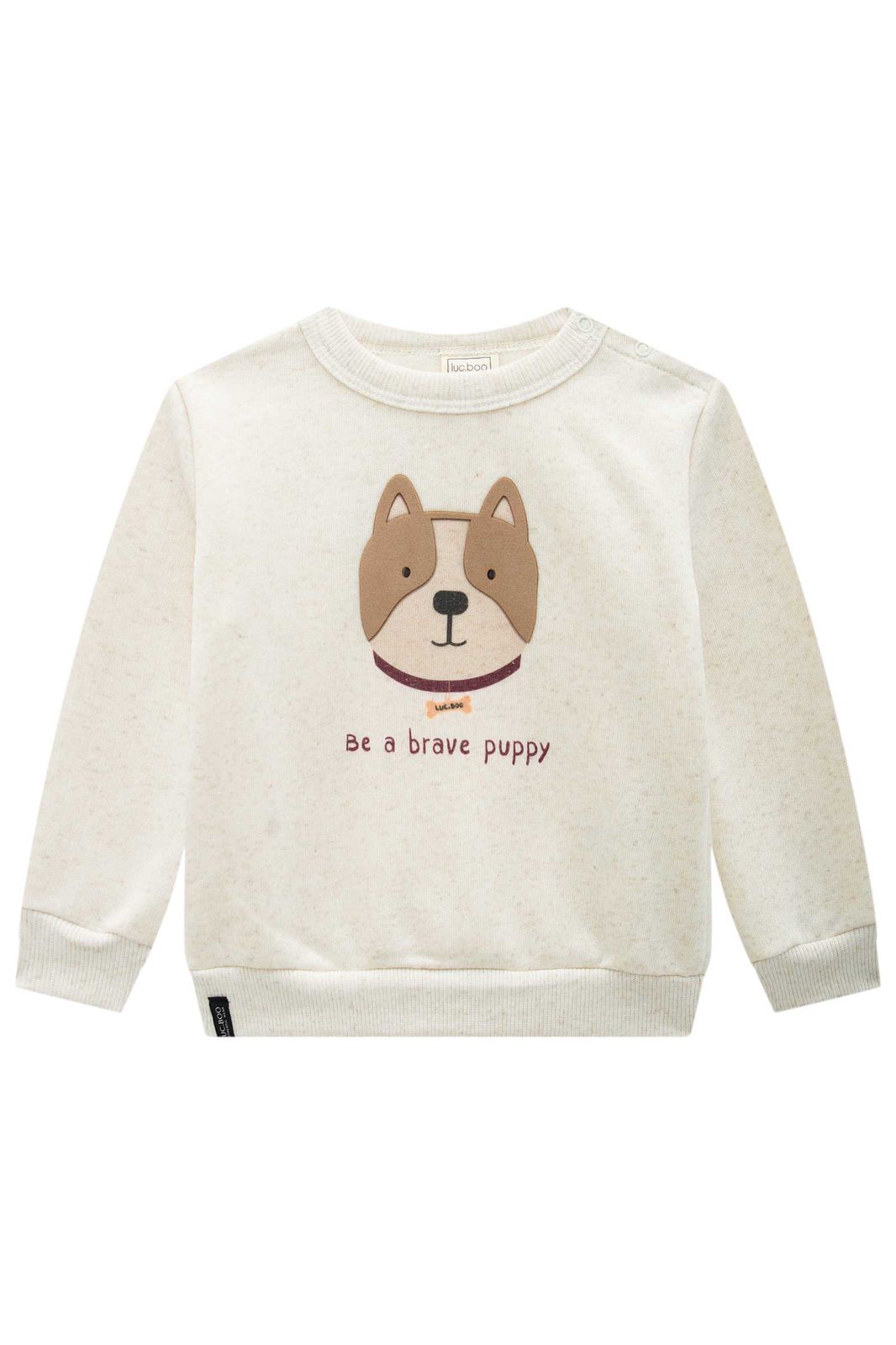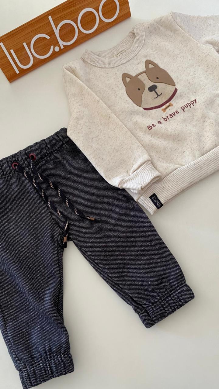 Esse conjunto infantil foi criado para acompanhar o seu menino em todos os momentos com muito conforto e carinho. O blusão em moletom off‑white tem estampa de cachorrinho e a frase “Be a brave puppy”, trazendo uma mensagem doce e cheia de coragem para o dia a dia. A calça jogger em tom preto mesclado completa o look com um ar moderno e fácil de combinar com outras peças do guarda‑roupa.